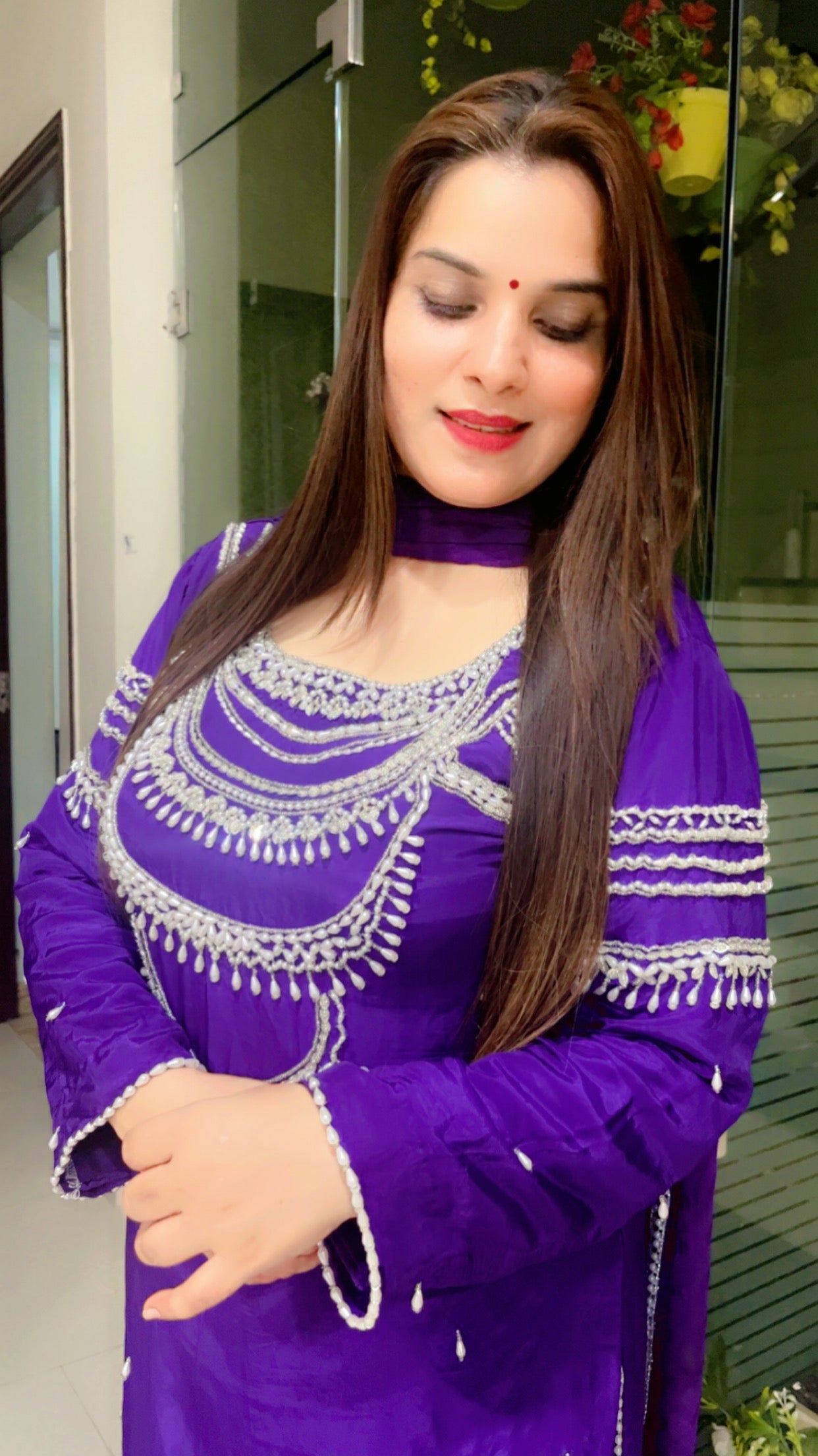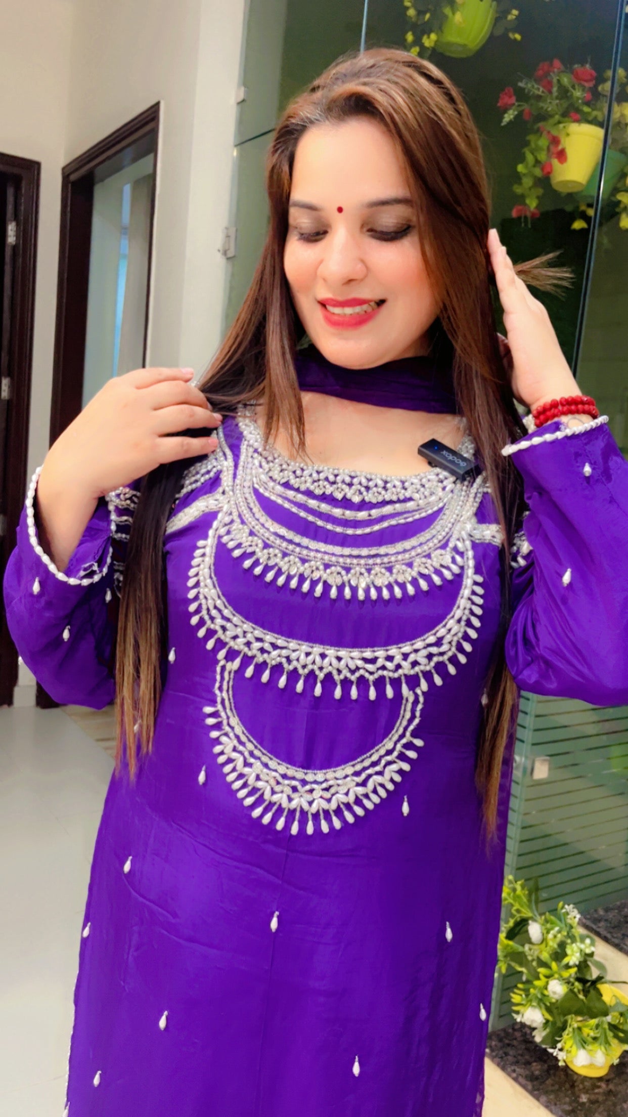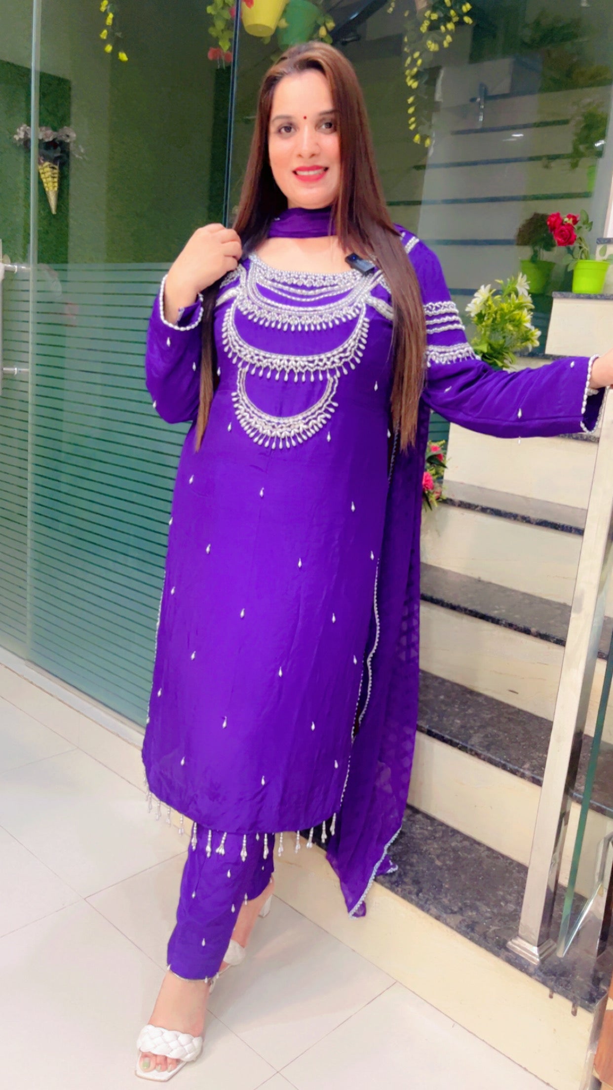 How are your preparations for this festive season going?Let's together cherish them through detailed work,elegant patterns and graceful shades amongst our hand-worked collection of suits for this wedding and festive season. Pure crepe completely hand-embroidered suit with beautiful neckline and tassel worked sleeves and pant. Along with stripped lace-worked dupatta.