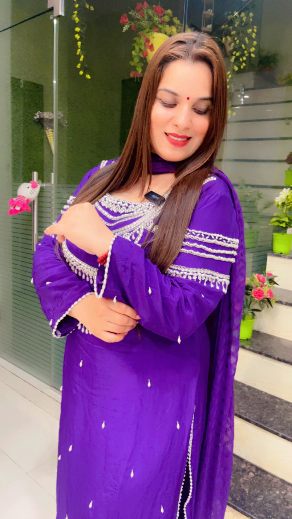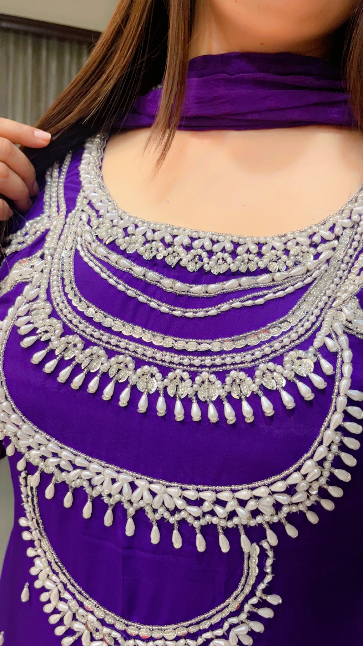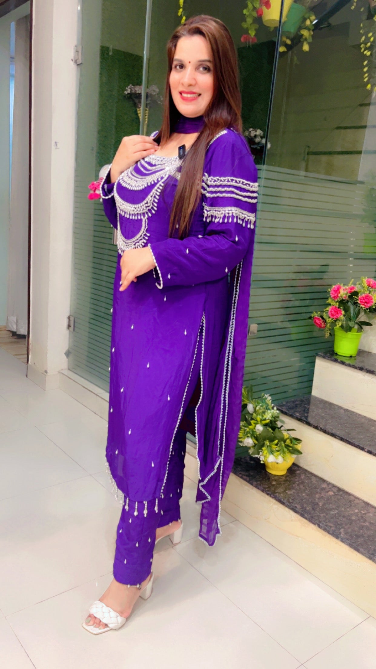 How are your preparations for this festive season going?Let's together cherish them through detailed work,elegant patterns and graceful shades amongst our hand-worked collection of suits for this wedding and festive season. Pure crepe completely hand-embroidered suit with beautiful neckline and tassel worked sleeves and pant. Along with stripped lace-worked dupatta.