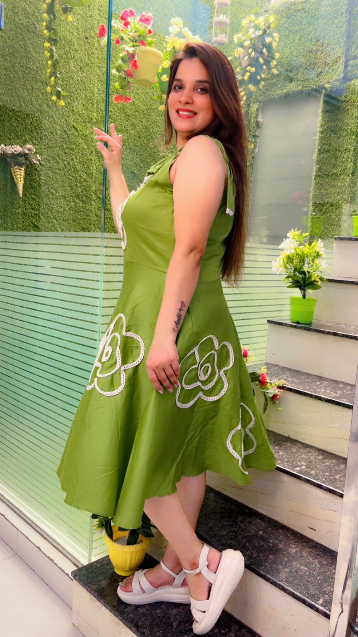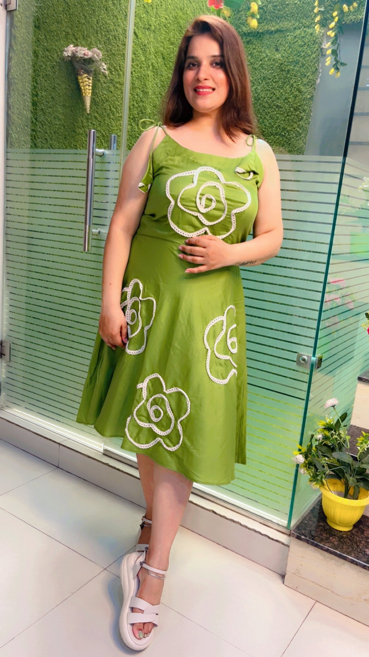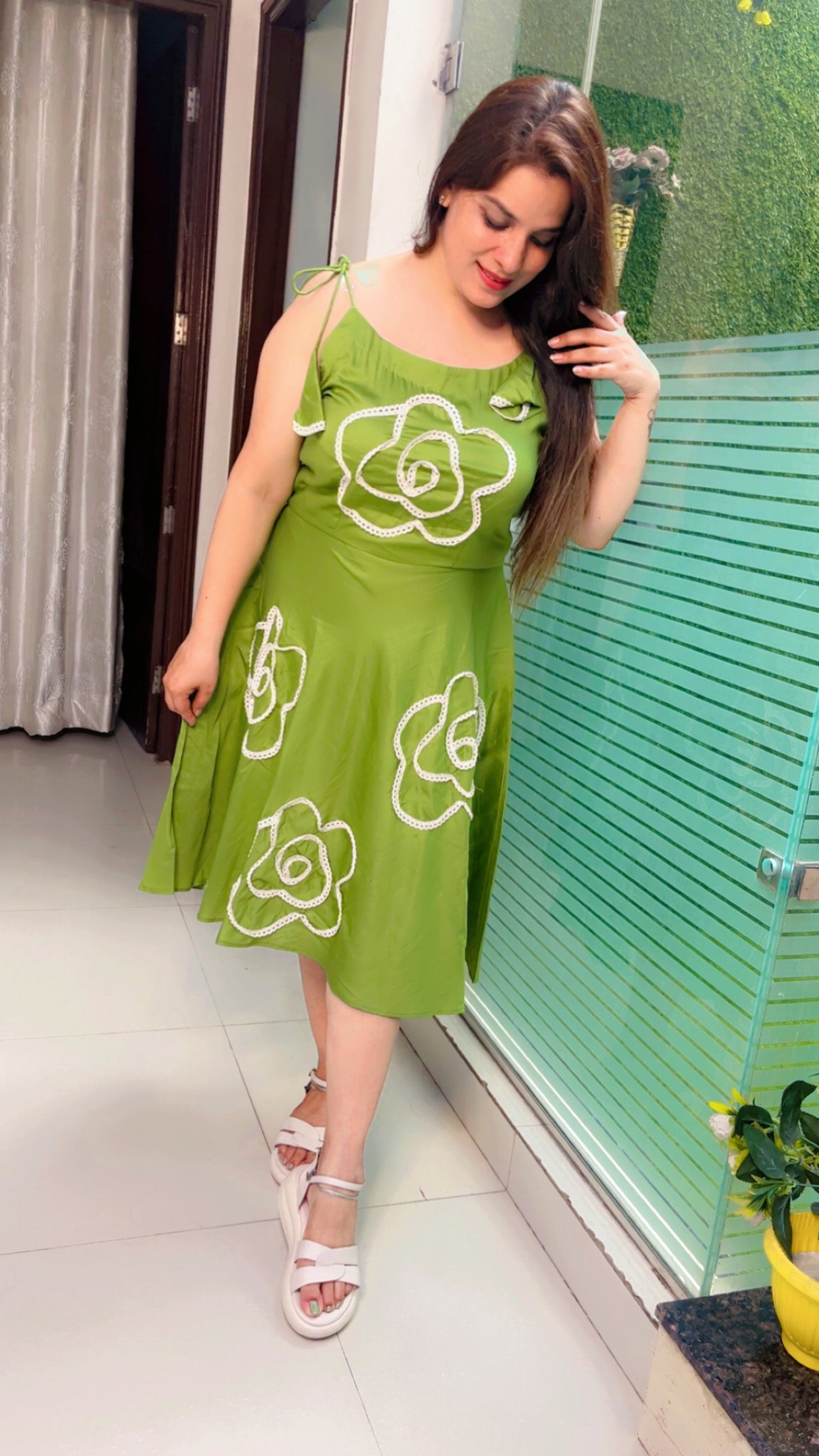 After a day busy wearing formal let's try something western now! Welcoming you all to the home of exceptional craftmanship and great designing! Green tunic with cotton lacing used to make a floral pattern both front and back along with tassel style sleeves.
