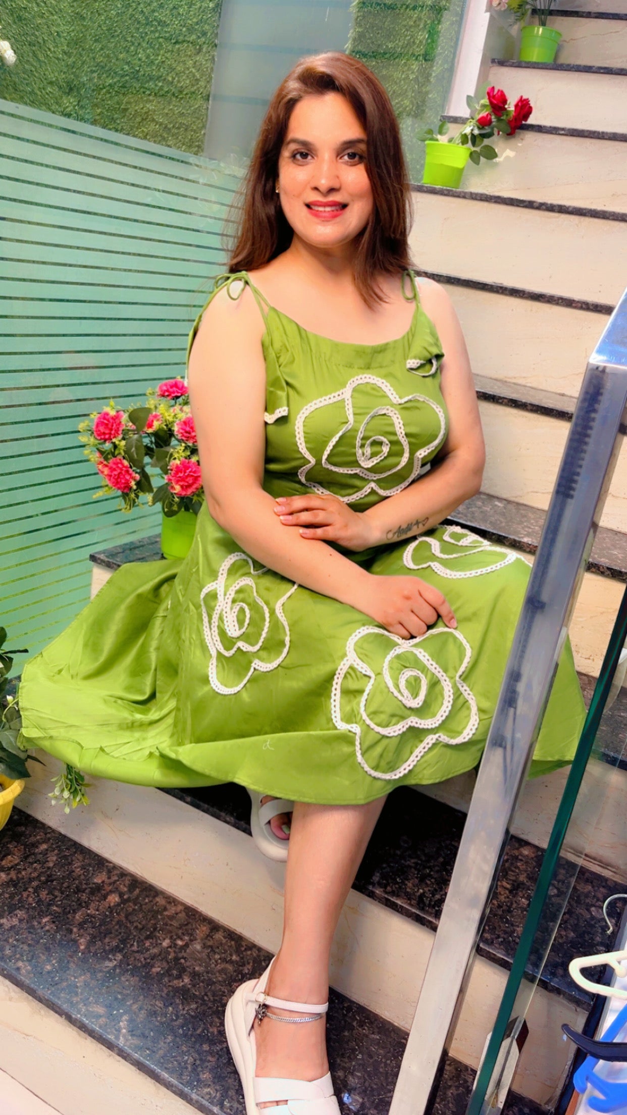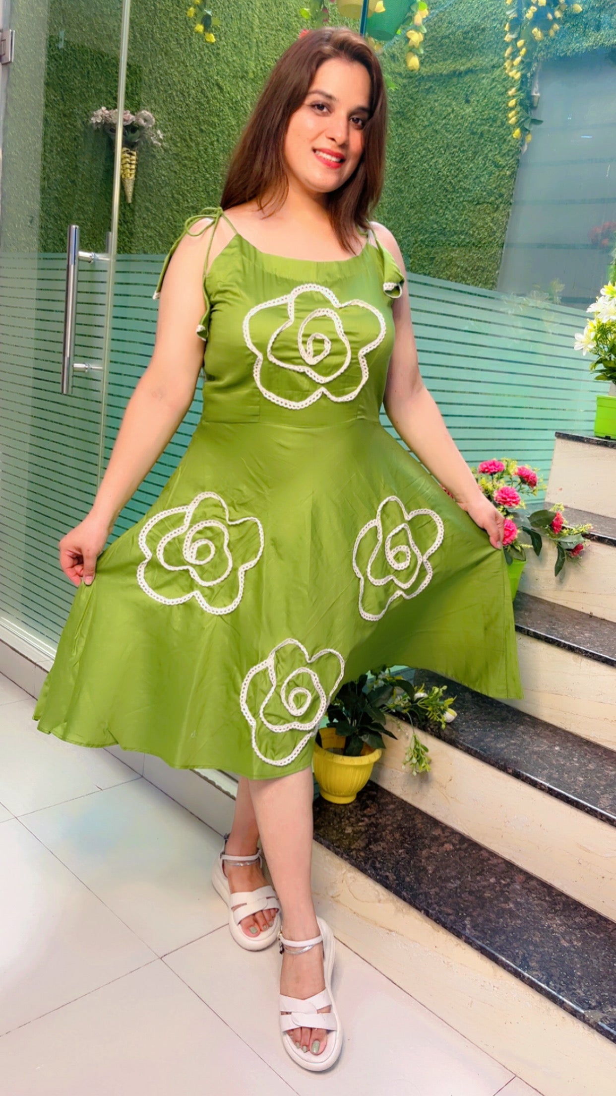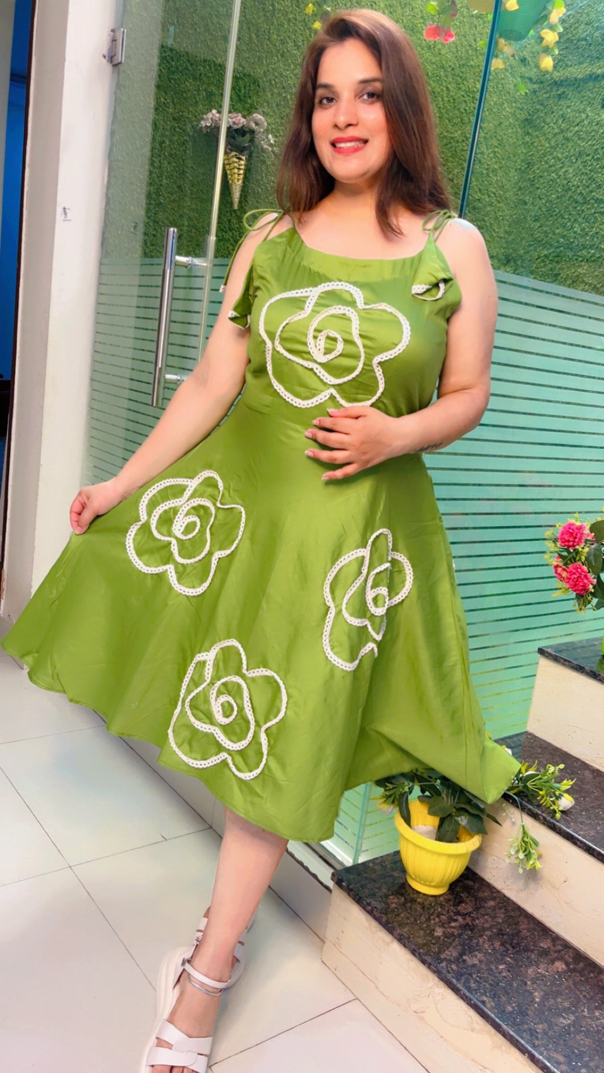After a day busy wearing formal let's try something western now! Welcoming you all to the home of exceptional craftmanship and great designing! Green tunic with cotton lacing used to make a floral pattern both front and back along with tassel style sleeves.