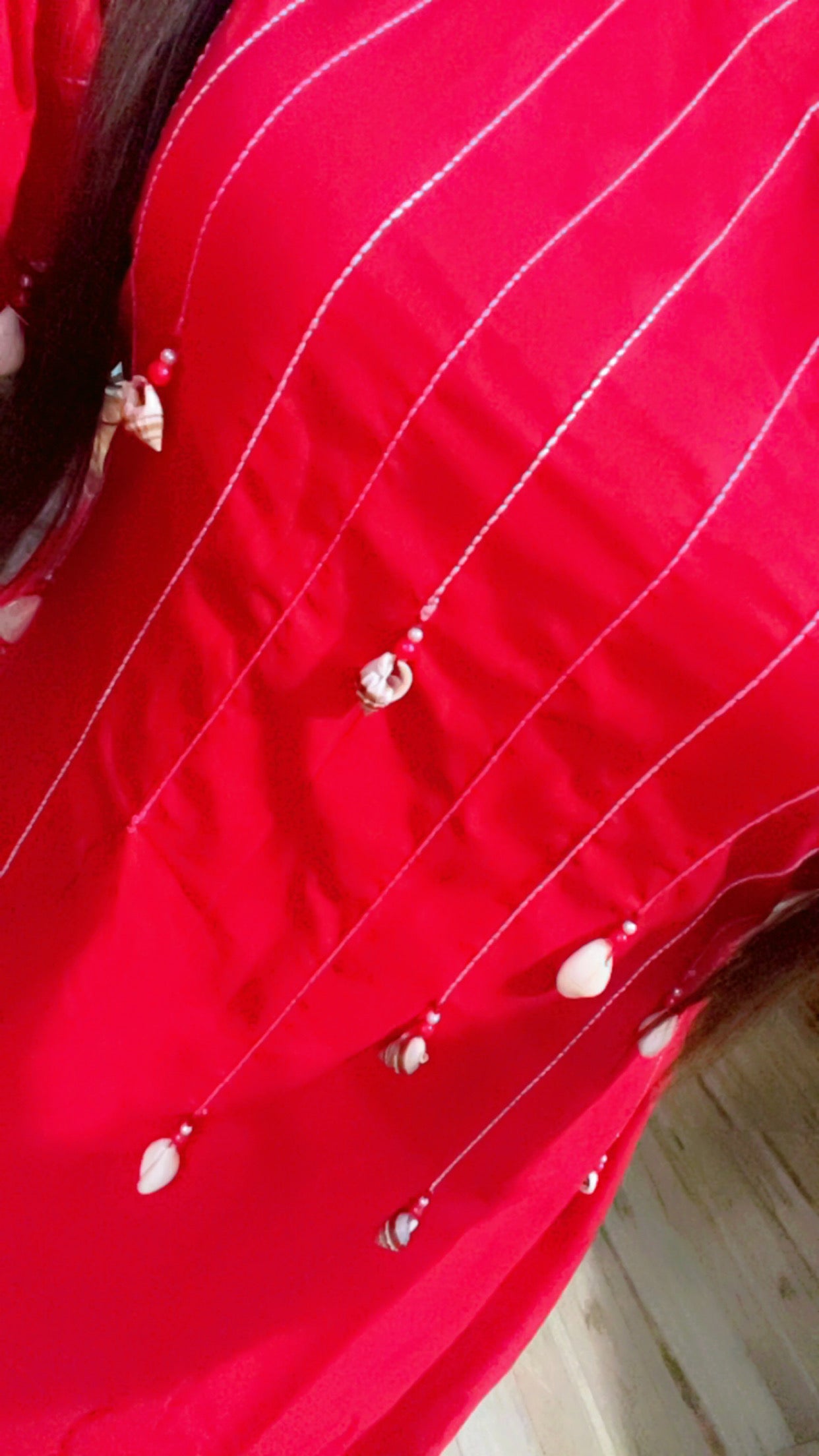 Anchor thread-worked rayon a-line designer co-ord set. With intricate highlighting of shells and pearl-work.
